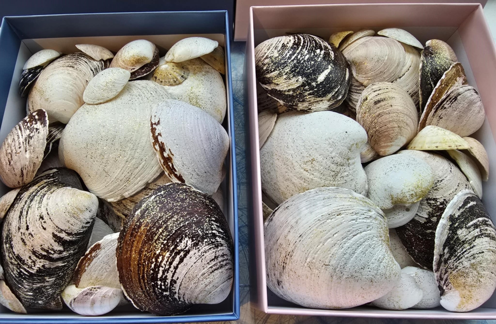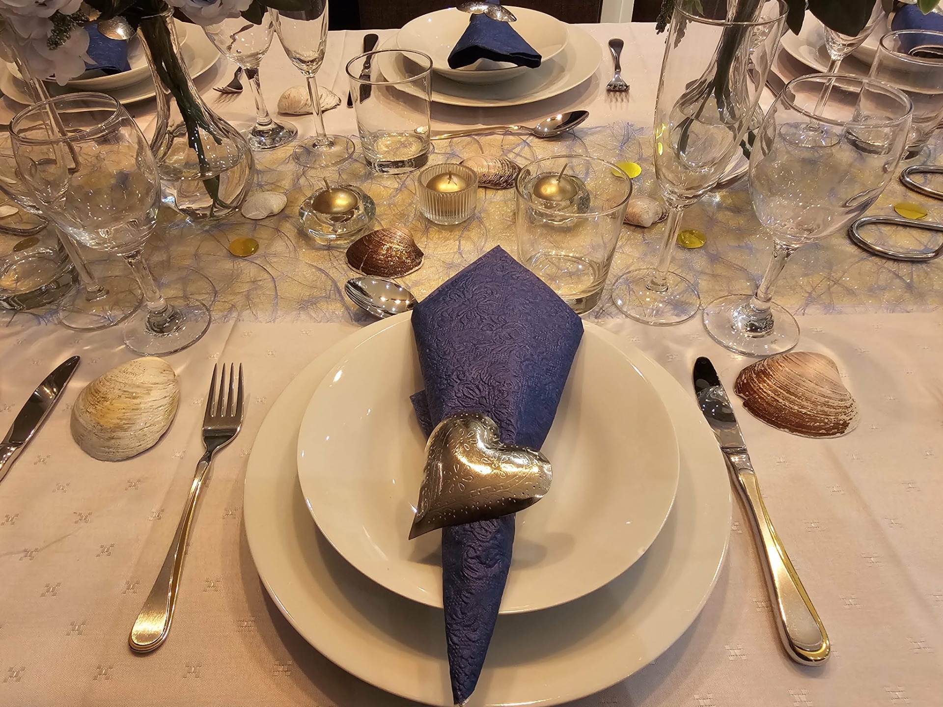 Skjell lakkert med gullglitterlakk – et dekorativt innslag som gir festbordet et maritimt og eksklusivt preg. De glitrer mer i virkeligheten enn bildet viser, og tilfører både stil og glans til oppdekningen.