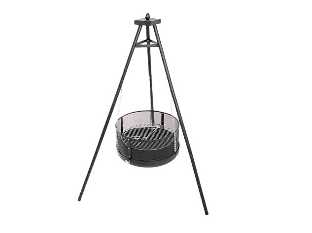 Med grillrist. Oppheng til kjele. Fungerer fint med både grillkull og ved.