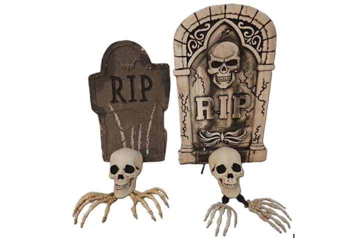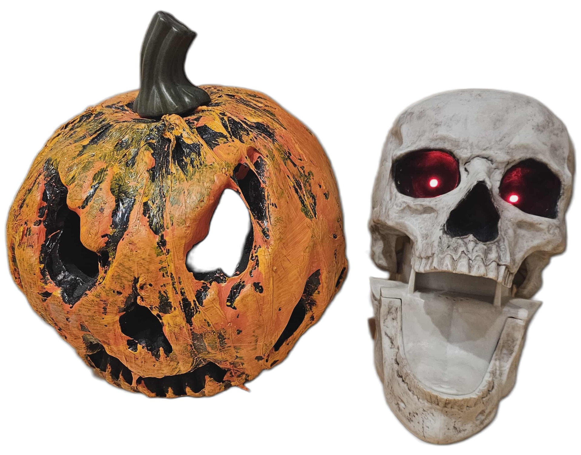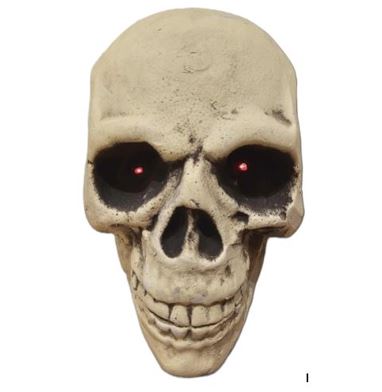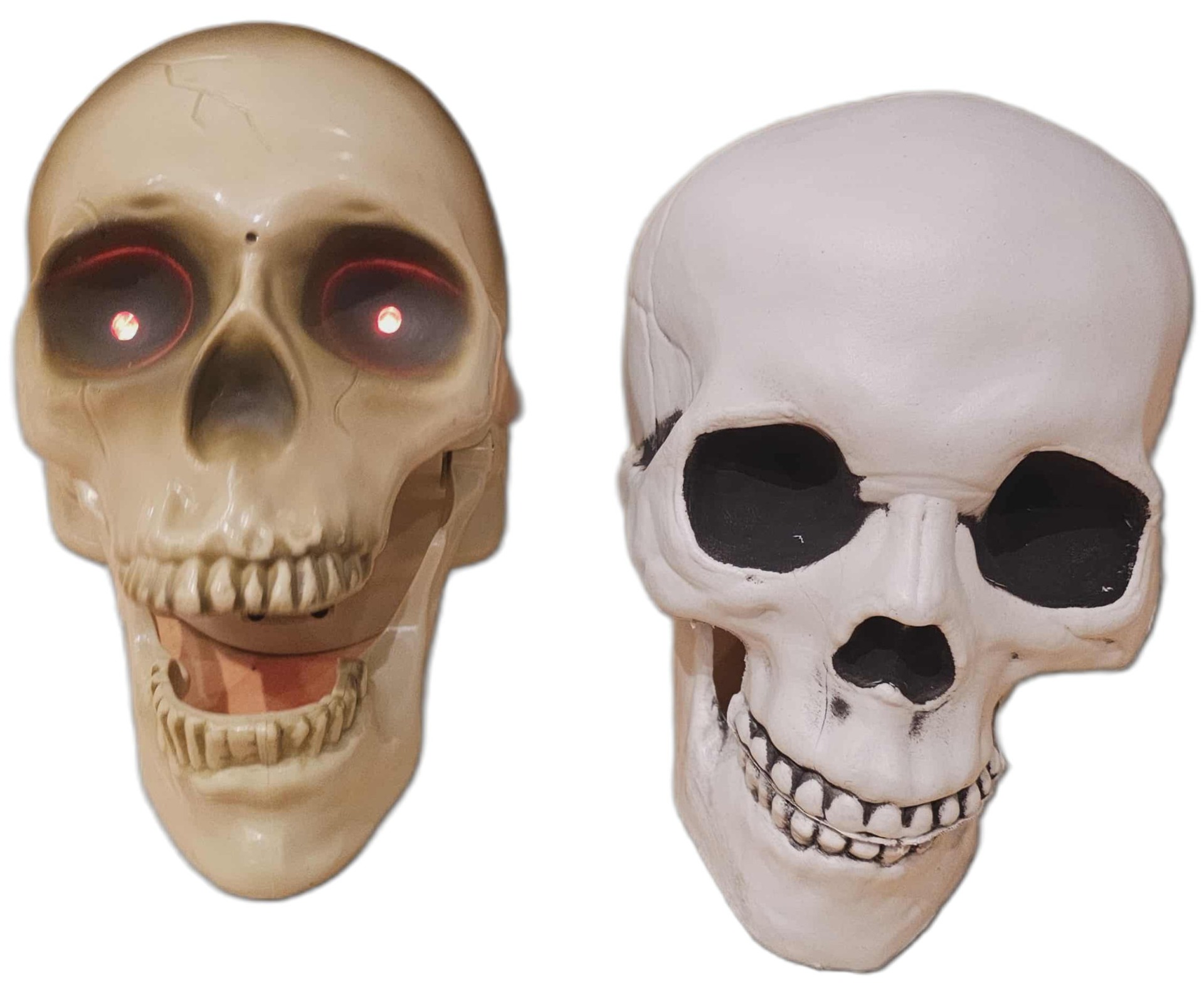 To hodeskaller. Den ene har lysende røde øyne, har en skummel latter og åpner munnen når den ler. Begge ca. 15 cm.