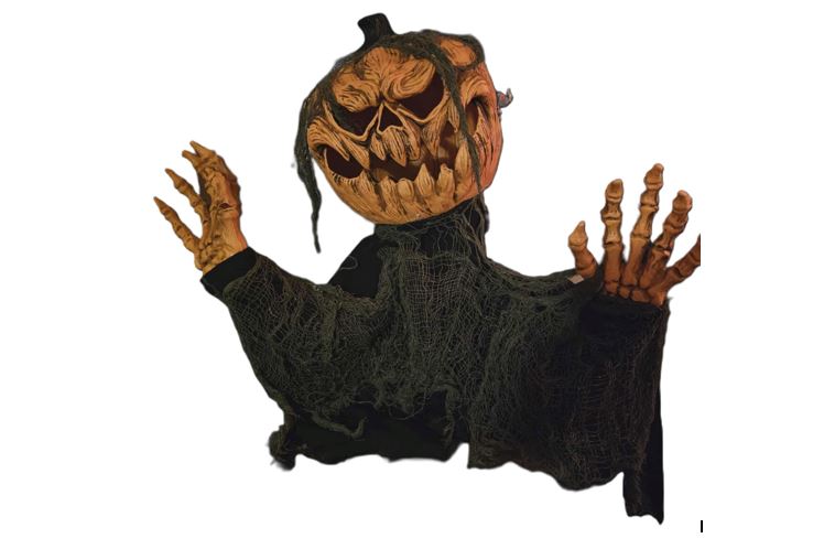 Rødt lys inni gresskaret. Armer og hodet beveger seg, mens det brøler. Ca. 50 cm. Står på stativ. Rimelig skummel - passer ikke for små barn.
