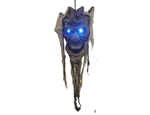 Skummelt spøkelse med blinkende lysende øyne. Ca. 160 cm. Henges opp med snor.
