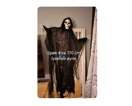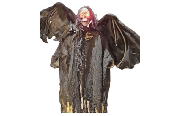 Skummelt spøkelse med mye lyd, blinkende øyne og vinger som beveger på seg. Ca. 1 meter lengde og ca 85 cm vingespenn. Henges opp med snor. Passer ikke for små barn...